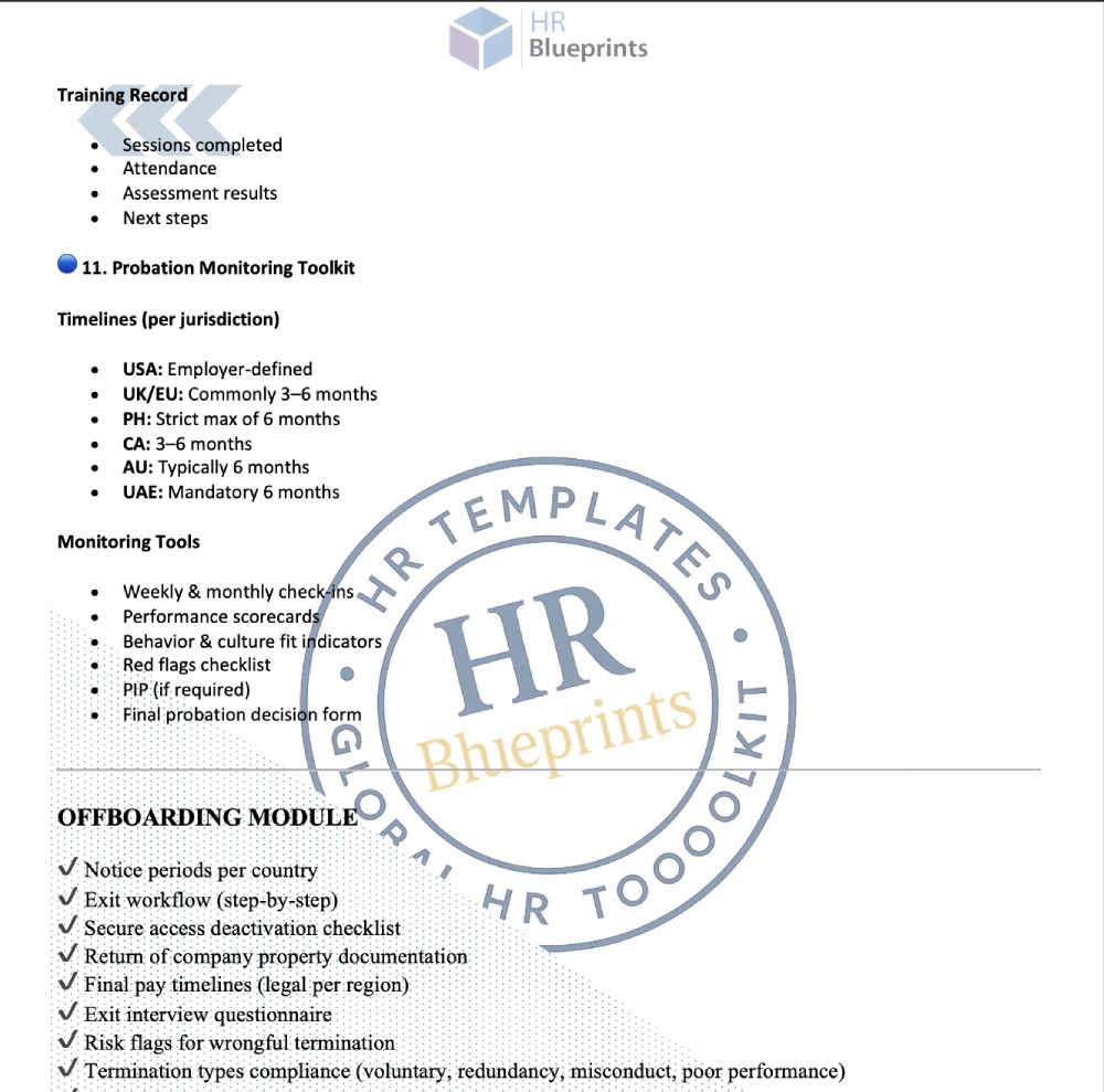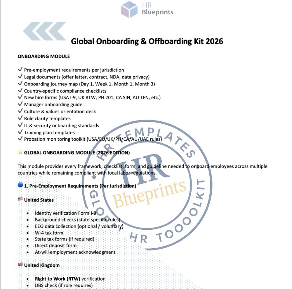 is a 19-page, fully editable HR lifecycle system that gives you a complete, compliant framework for hiring, onboarding, and exiting employees across the USA, EU, UK, Philippines, Canada, Australia, and UAE.